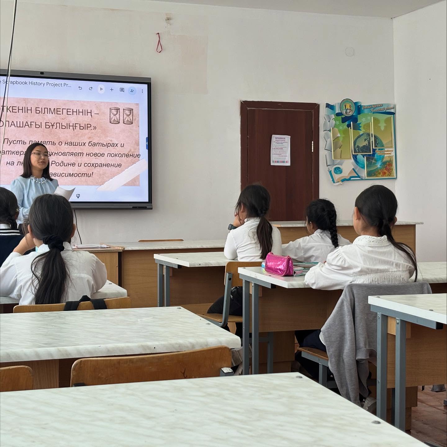 Сабақ барысында оқушылар тәуелсіз еліміздің тарихымен, ұлттық құндылықтармен және елдің дамуына үлес қосқан тұлғалар өмірімен танысты.